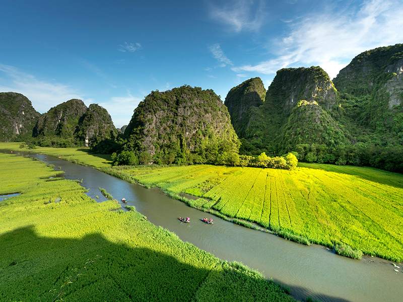 - Discover Tam Coc by traditional bamboo or sampan boat, gliding through mystical limestone caves and breathtaking scene