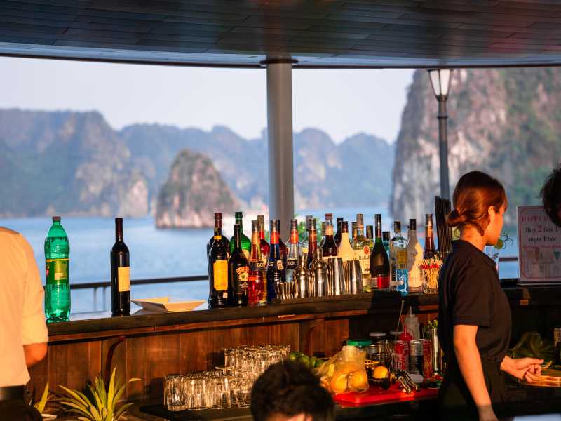 Joining us for Cooking demonstration to learn how to make one of the most famous Vietnamese cuisines, the spring rolls. Or reach the top deck of cruise where the guests can admire the magnificent sunset over the Gulf of Tonkin. Enjoy a Happy Hour time - BUY ONE GET ONE FREE at the bar. It is an ideal time for photography enthusiasts to capture the greatest moment of sunset over Lan Ha Bay.
