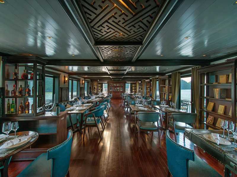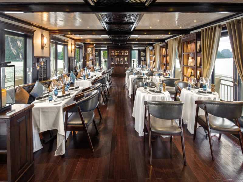 08:50 Breakfast will be served at Restaurant while the cruise passes by Thien Cung and Dau Go Cave and the Fighting Cock Islet.