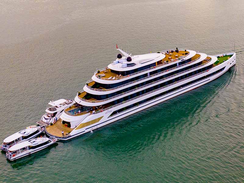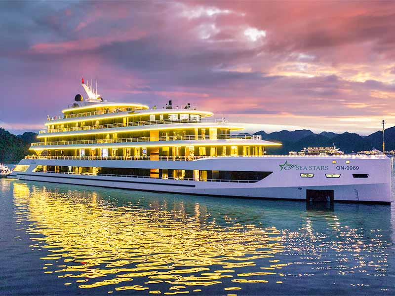 Board the Sea Stars Cruise. Enjoy a welcome drink while the cruise manager briefs you about the special itinerary crossing both Bai Tu Long Bay & Ha Long Bay, along with safety regulations.
